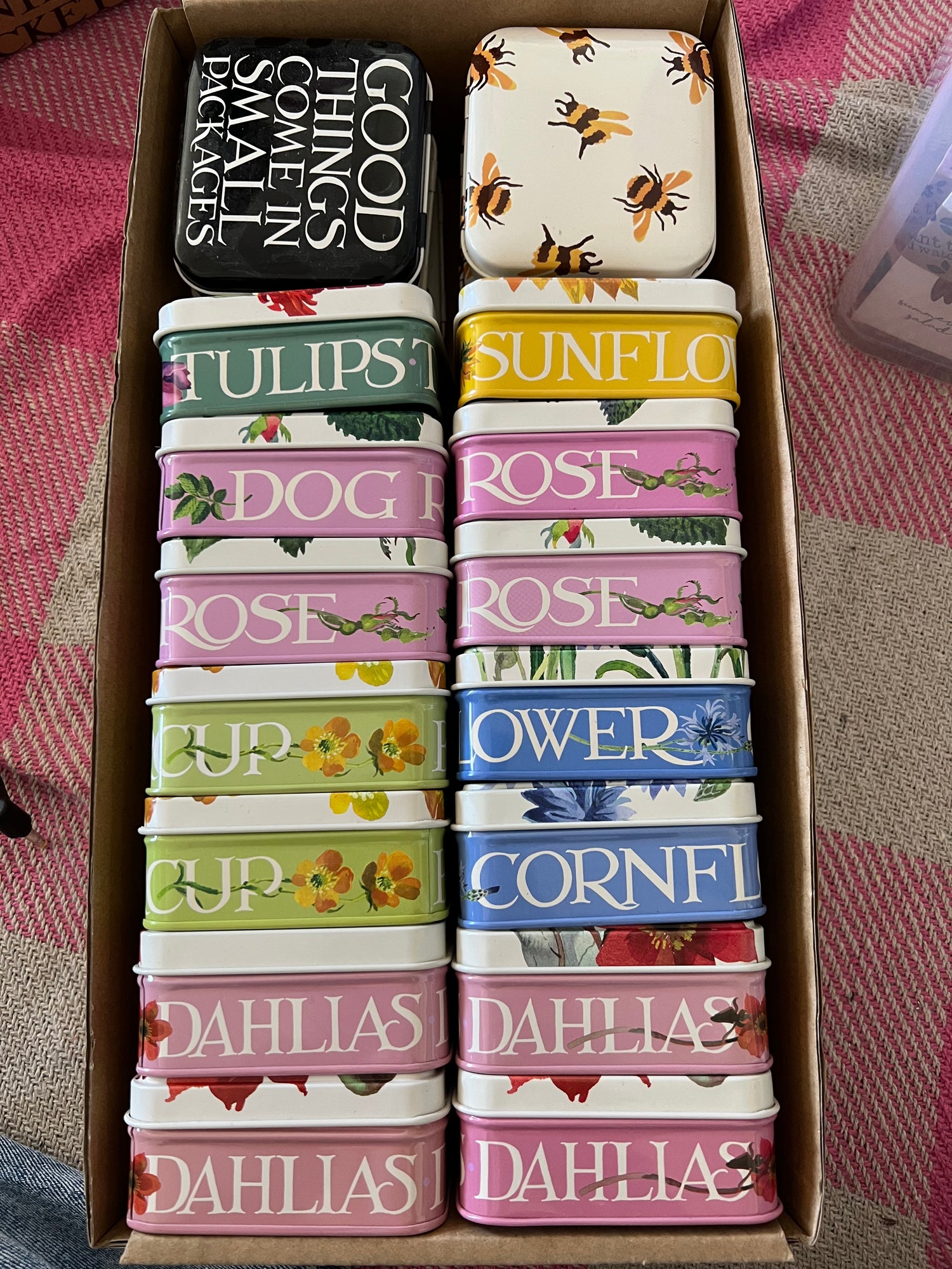 All products with a pink chequered blanket background. Just for aesthetics!