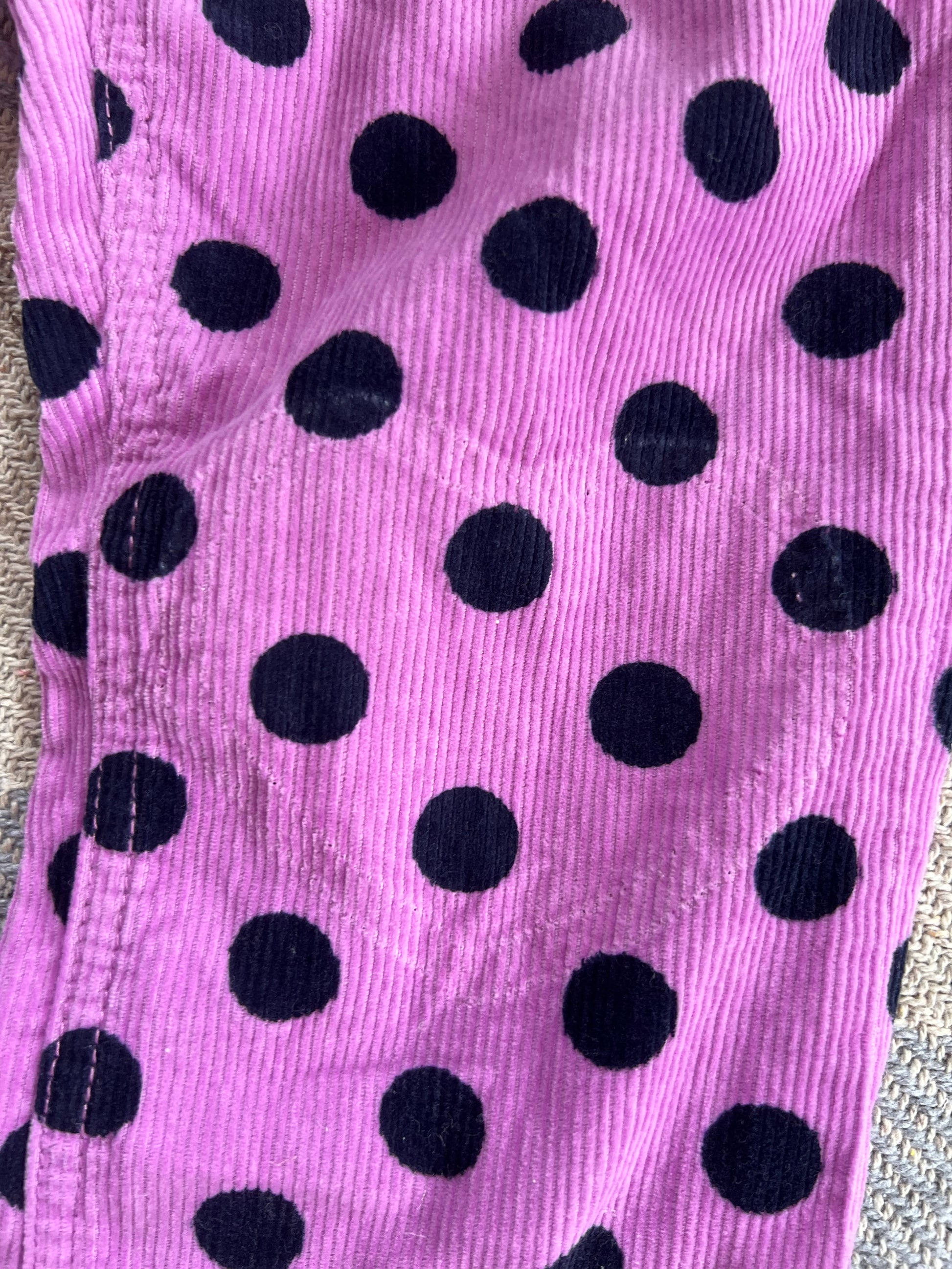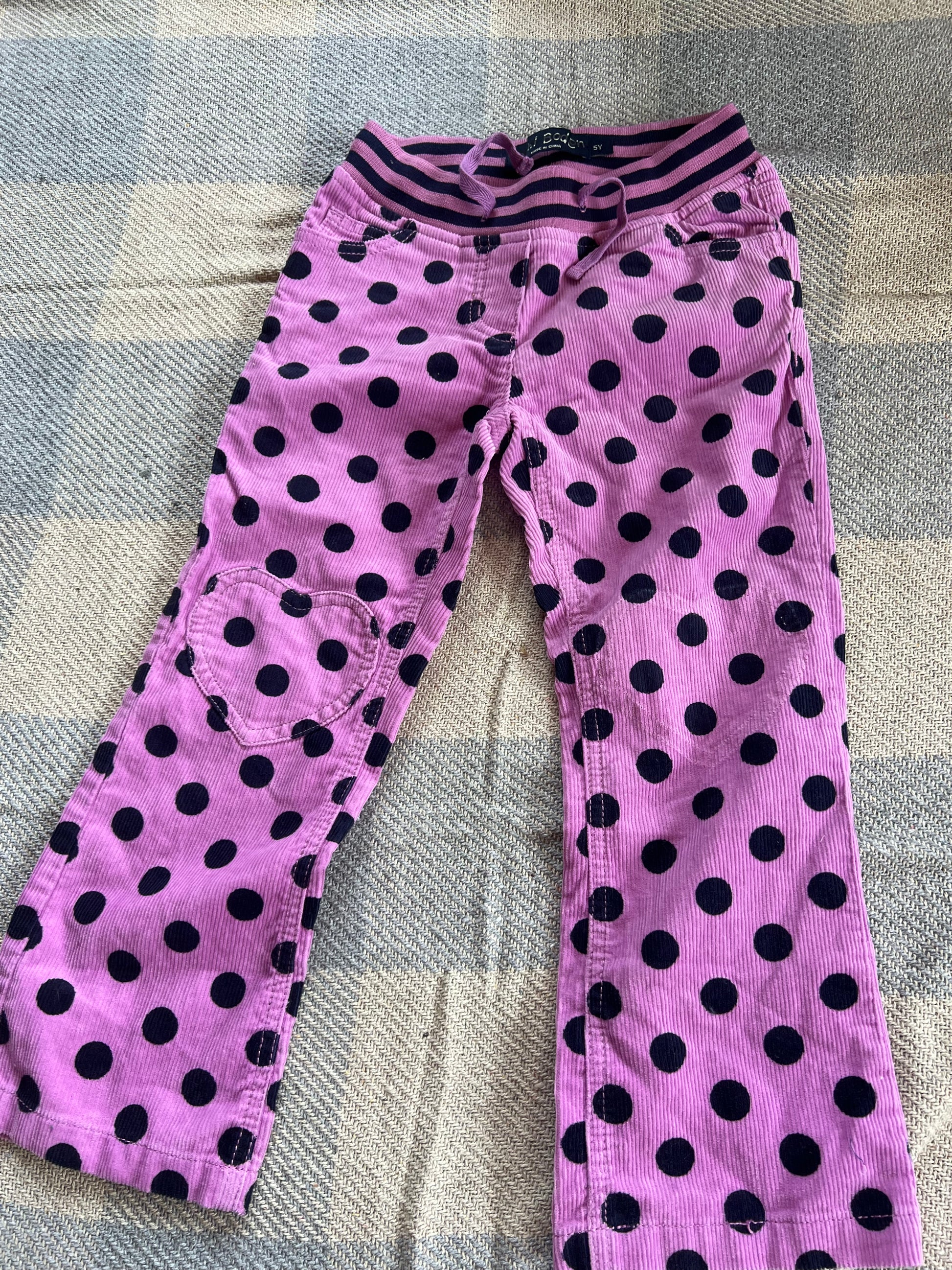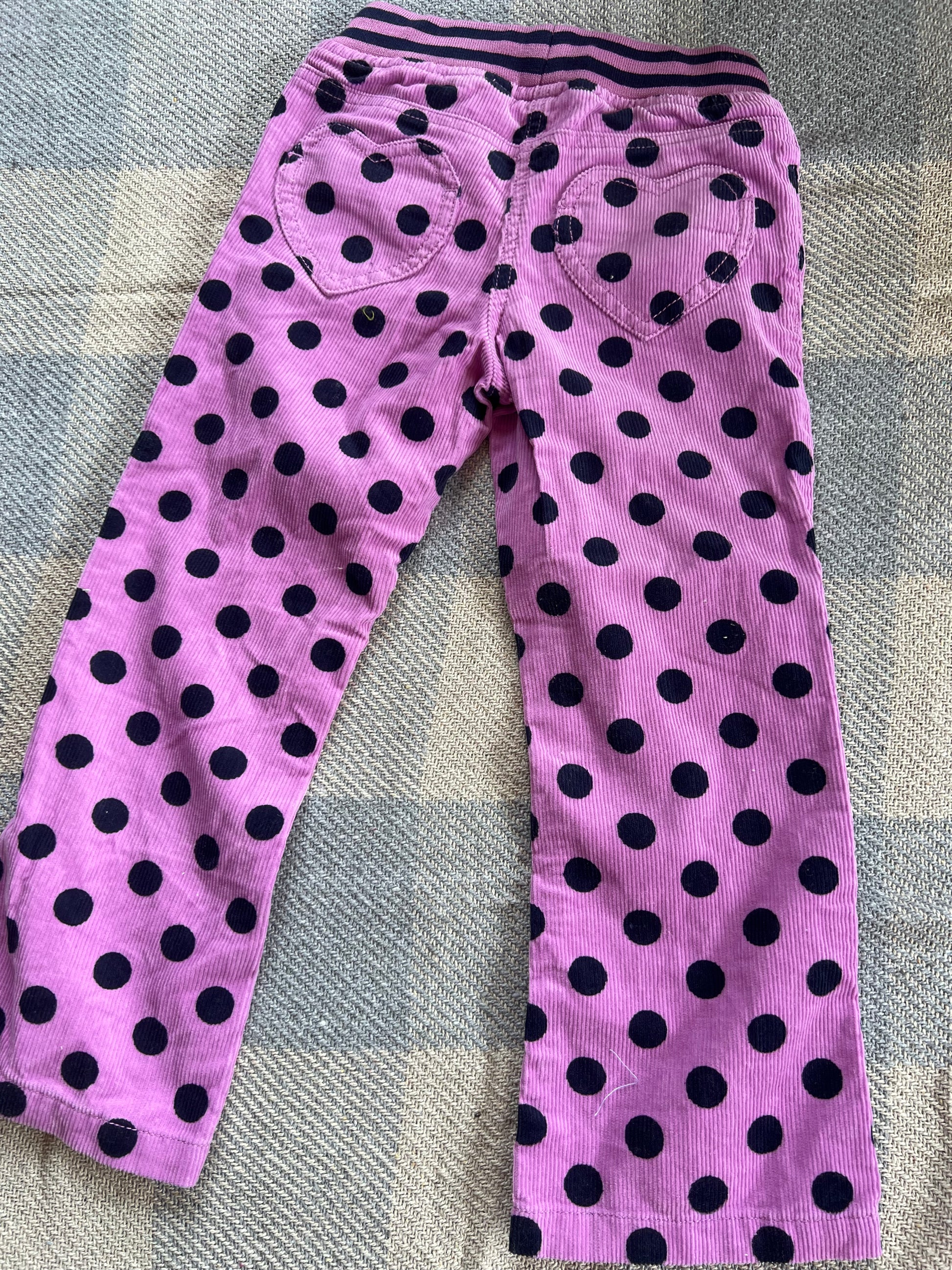 Mini boden purple trousers missing heart patch on left leg front size 5y