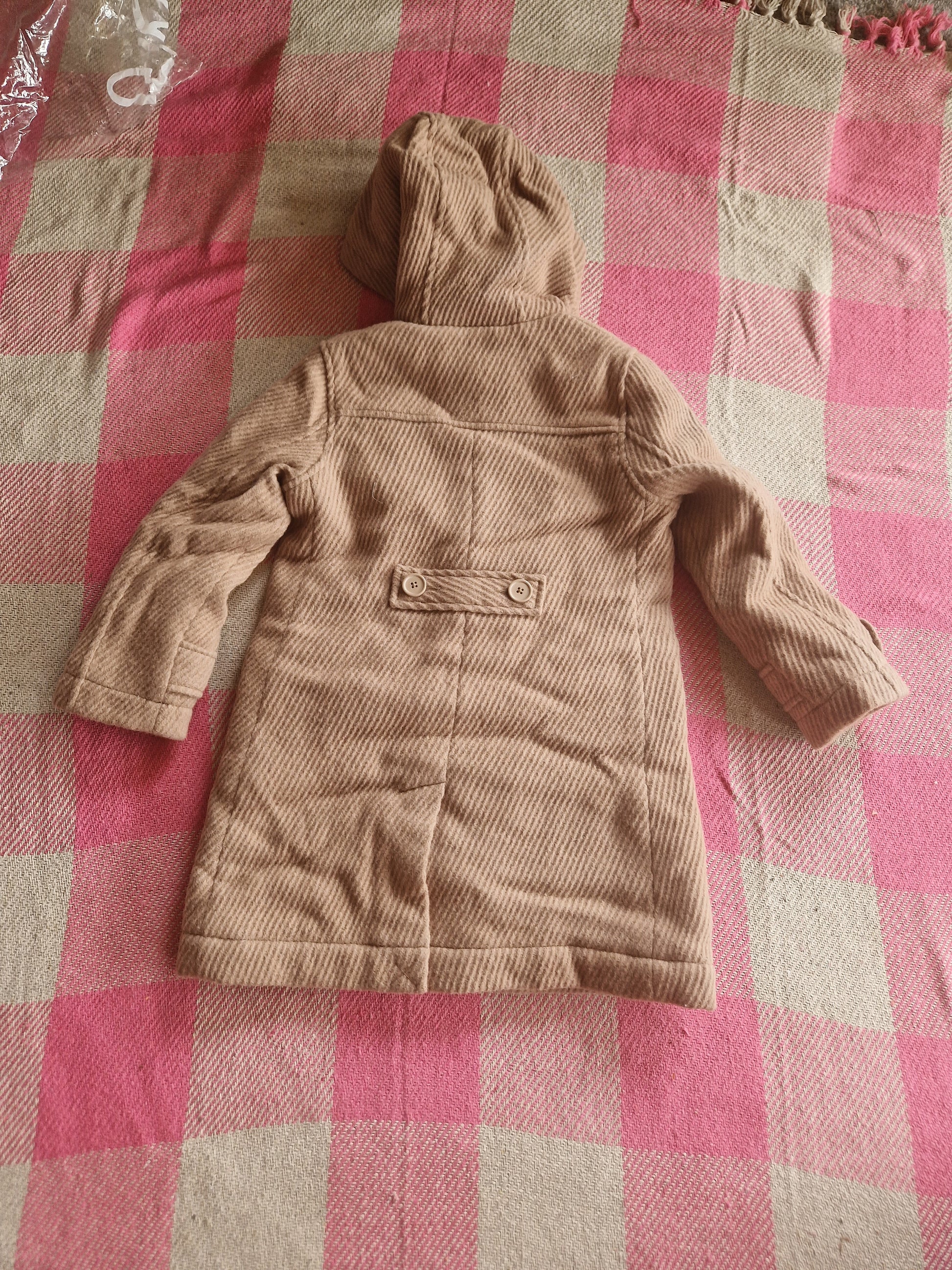 Mini boden raincoat for a 5-6 year old. Exterior is a beige 80% wool 20% nylon blend. Lining is 100% polyester.