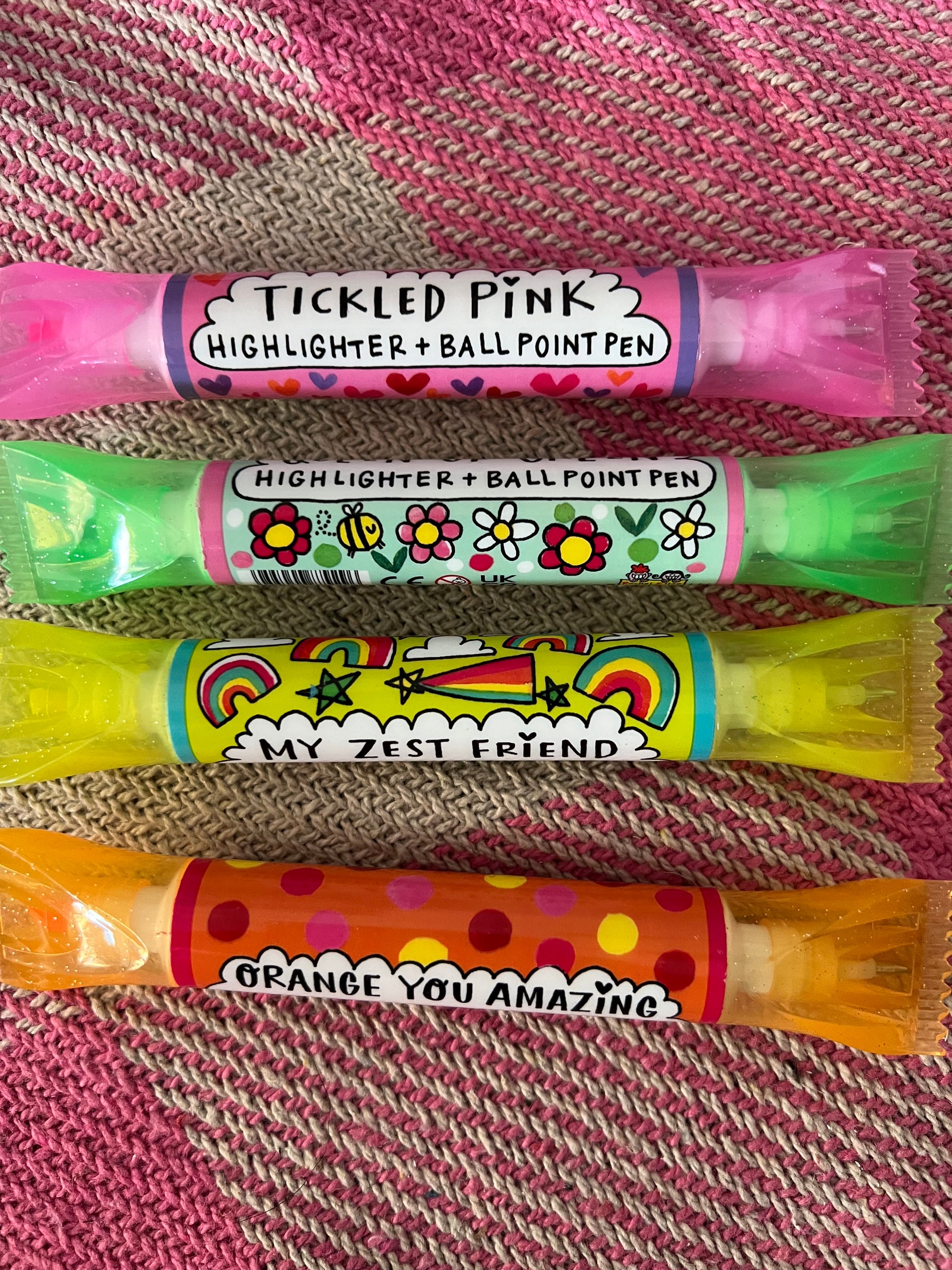 Dual-ended highlighter/pen combo from Rachel Ellen. Comes in four different colours.