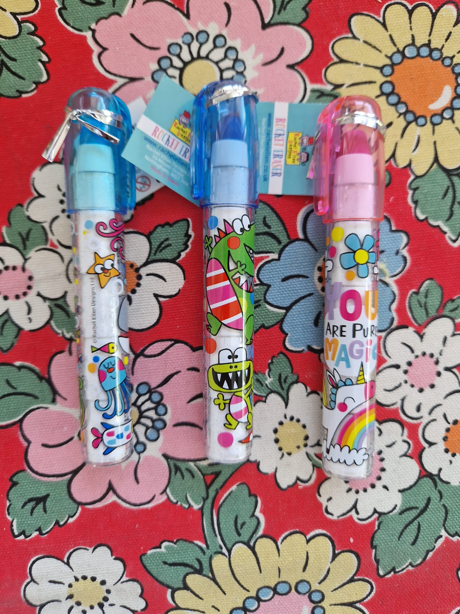 Rocket eraser which has 5 different rubbers inside the capsule, easy to rub out any oopsies made using writing like motions, available in 3 different colours